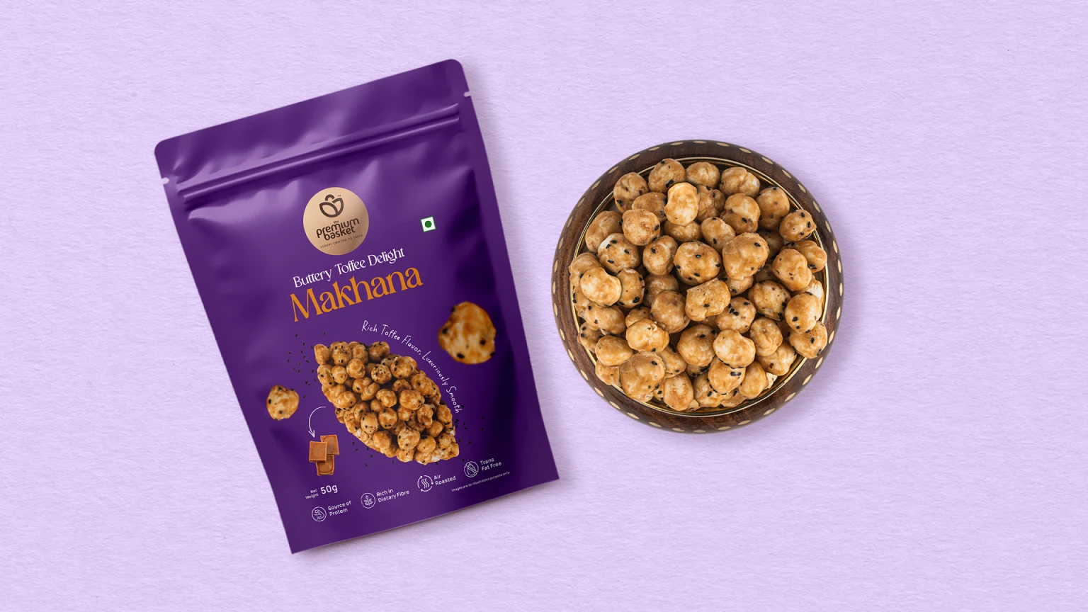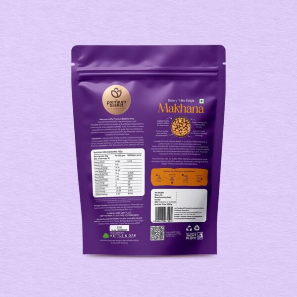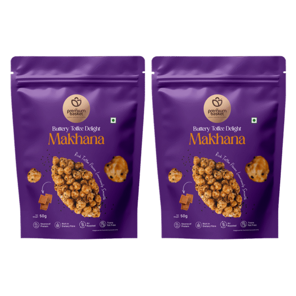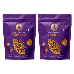 Buttery Toffee Delight Makhana is high in protein, rich in fiber, transfat-free, and air-roasted, combining indulgence with nourishment in every crunchy bite.