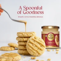 Every jar of our Cashew Butter is made from premium Goan cashews, lightly roasted to unlock their natural sweetness and nutty aroma. Blended to silky perfection, it’s smooth, spreadable, and simply irresistible.