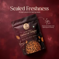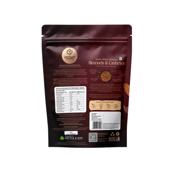 The defining moment comes when each nut is seasoned with Natural Hickory Smoke Flavour for a deep, bold taste, capturing a rich, earthy aroma and a perfectly balanced, barbecue-style flavor. The result is a premium, roasted snack that embodies both craftsmanship and nutrition.