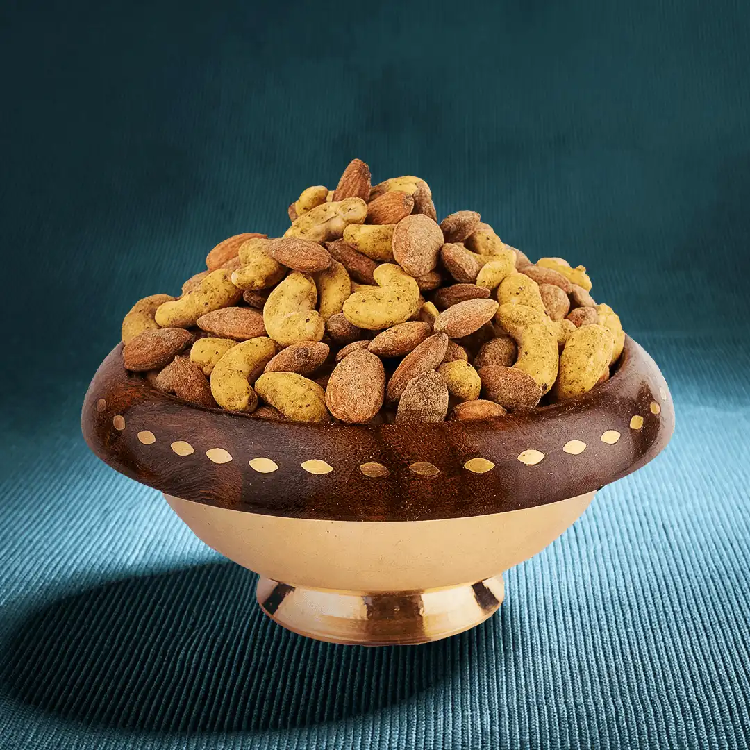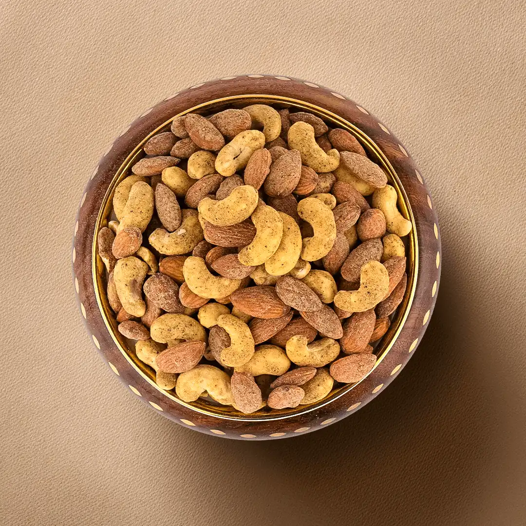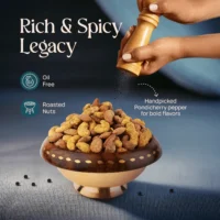 Each nut is evenly coated with a pepper-and-salt mixture that highlights the spice’s fragrant heat while letting the natural nuttiness shine through. The result is a gourmet balance of spice, texture, and nutrition, paying homage to the rich spice heritage of southern India.