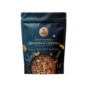 Each almond and cashew is expertly air-roasted, ensuring a natural crunch and golden texture. The distinctive pepper used in this blend — harvested from the spice farms of Pondicherry — adds a refined heat and earthy aroma, resulting in a flavor that is both bold and balanced.