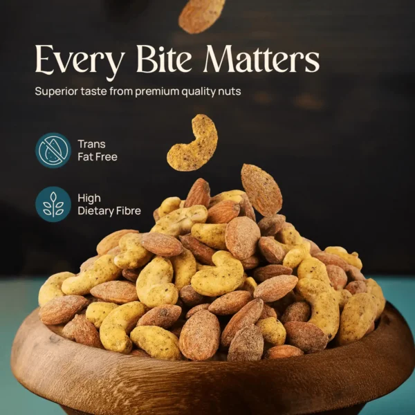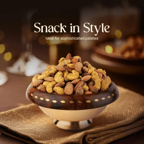 Each nut is evenly coated with a pepper-and-salt mixture that highlights the spice’s fragrant heat while letting the natural nuttiness shine through. The result is a gourmet balance of spice, texture, and nutrition, paying homage to the rich spice heritage of southern India.