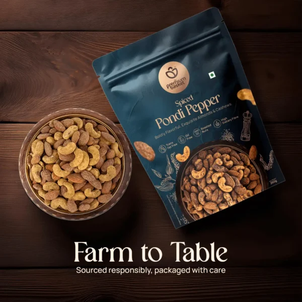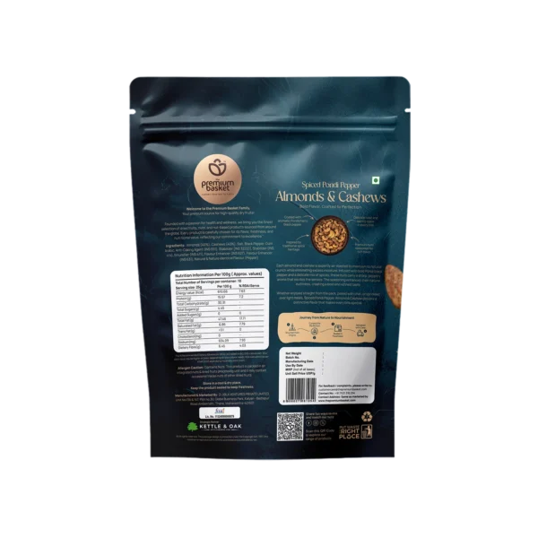 Each almond and cashew is expertly air-roasted, ensuring a natural crunch and golden texture. The distinctive pepper used in this blend — harvested from the spice farms of Pondicherry — adds a refined heat and earthy aroma, resulting in a flavor that is both bold and balanced.