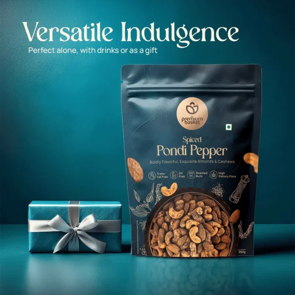 Indulge in the bold sophistication of Spiced Pondi Pepper Almonds & Cashews — a fusion of tradition, flavor, and nutrition — crafted to perfection for those who appreciate authenticity and elegance in every bite.