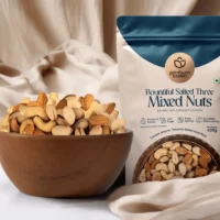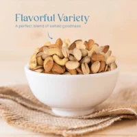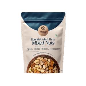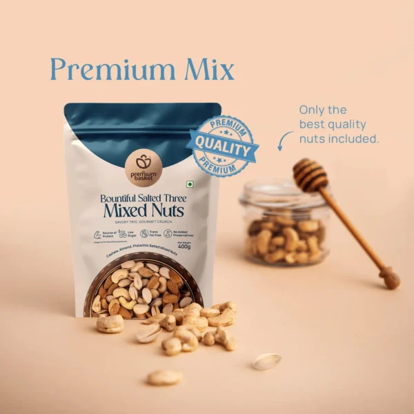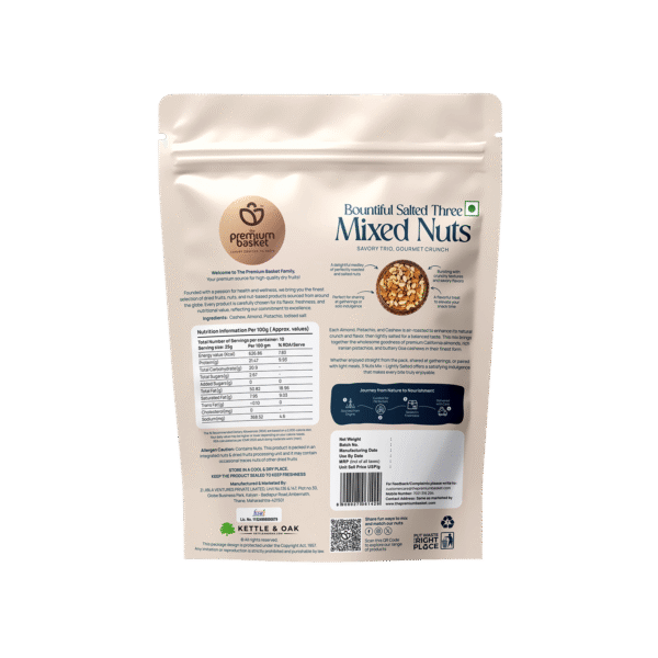 Savor the refined simplicity of Bountiful Salted Three Mixed Nuts, a gourmet fusion of the world’s finest nuts — Goa Cashews, California Almonds, and Iranian Pistachios.