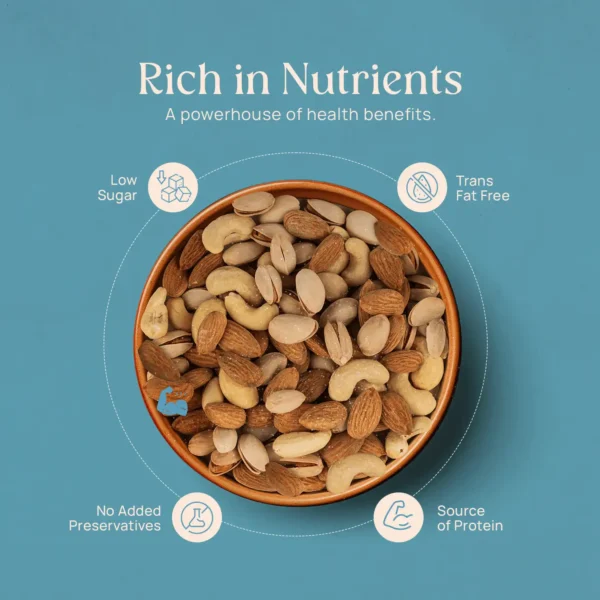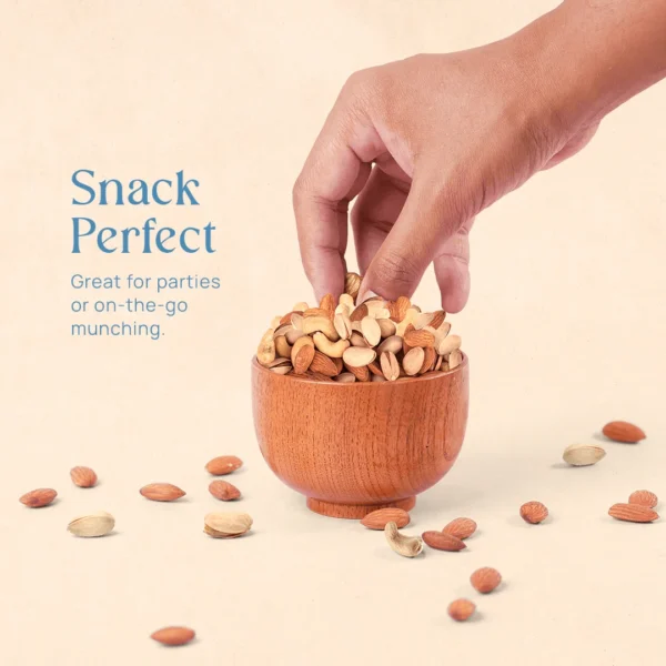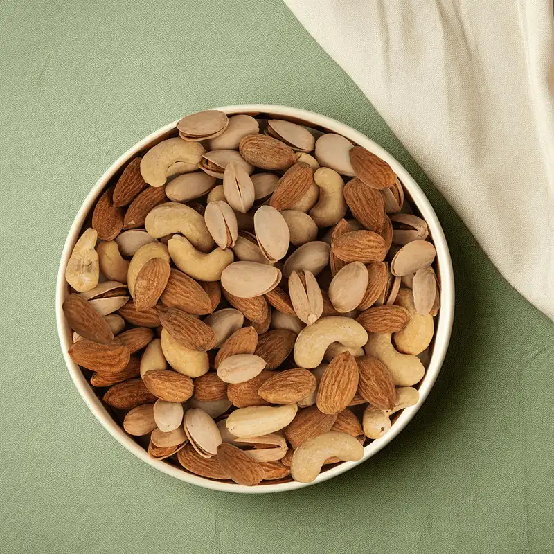 A gourmet blend of Goa Cashew, California Almond, and Iran Pistachio, lightly roasted and salted to perfection, offering rich flavor and superior nutrition.