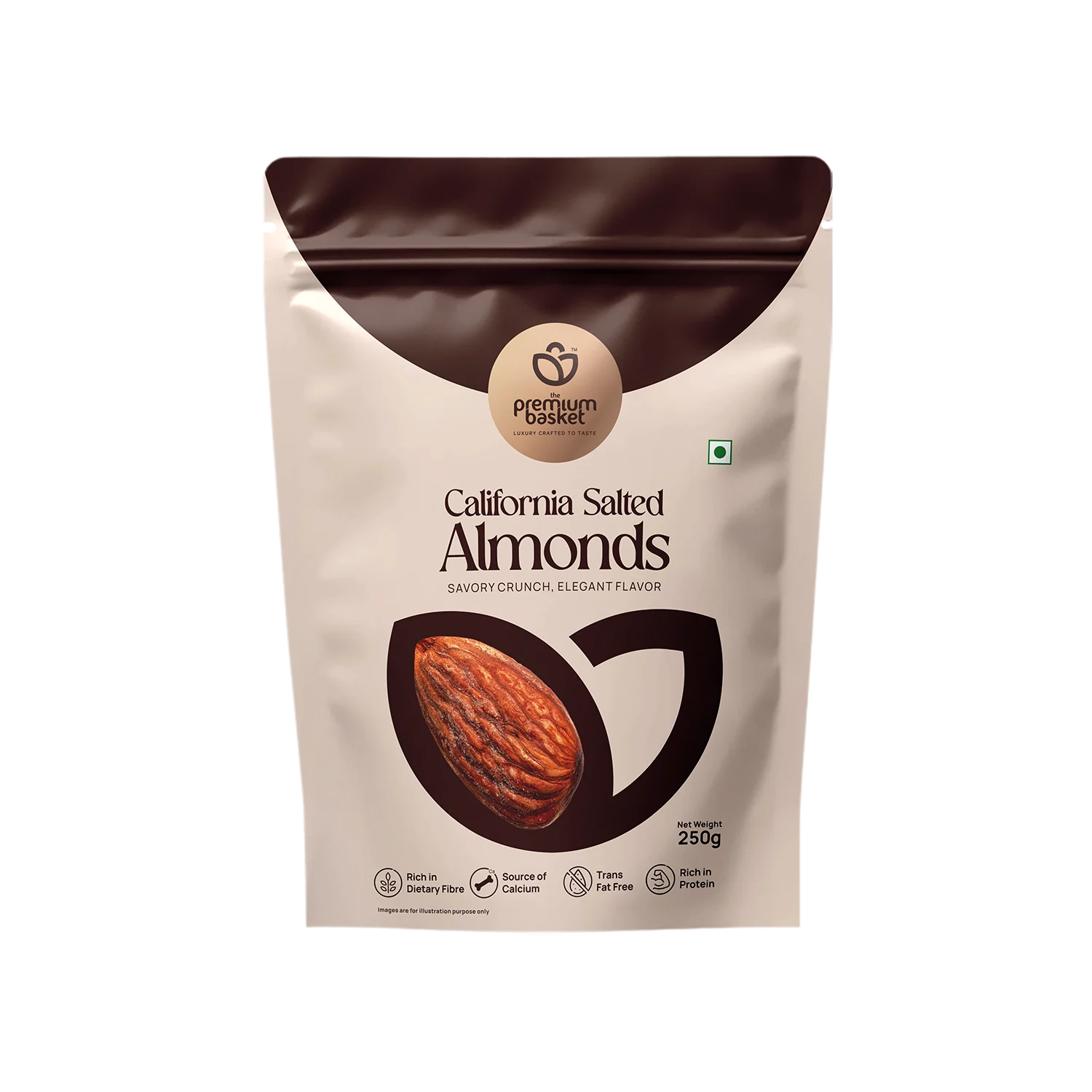 Experience the refined taste of California Salted Almonds – Premium Gold, where natural crunch meets perfectly balanced seasoning.