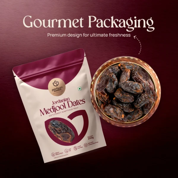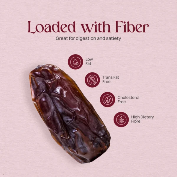 Being low in fat, cholesterol free, and trans fat free, Jordanian Medjool Dates support mindful nutrition. As a source of dietary fibre, they contribute to digestive wellness and sustained fullness, making them an ideal addition to a balanced lifestyle.