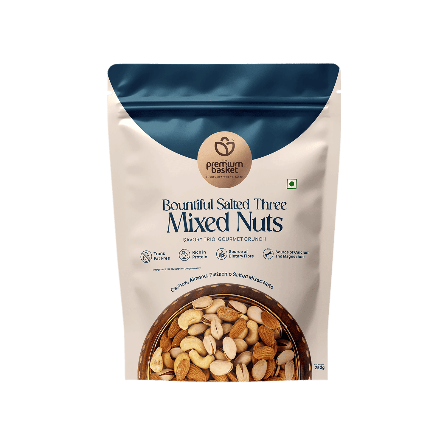 A gourmet blend of Goa Cashew, California Almond, and Iran Pistachio, lightly roasted and salted to perfection, offering rich flavor and superior nutrition.