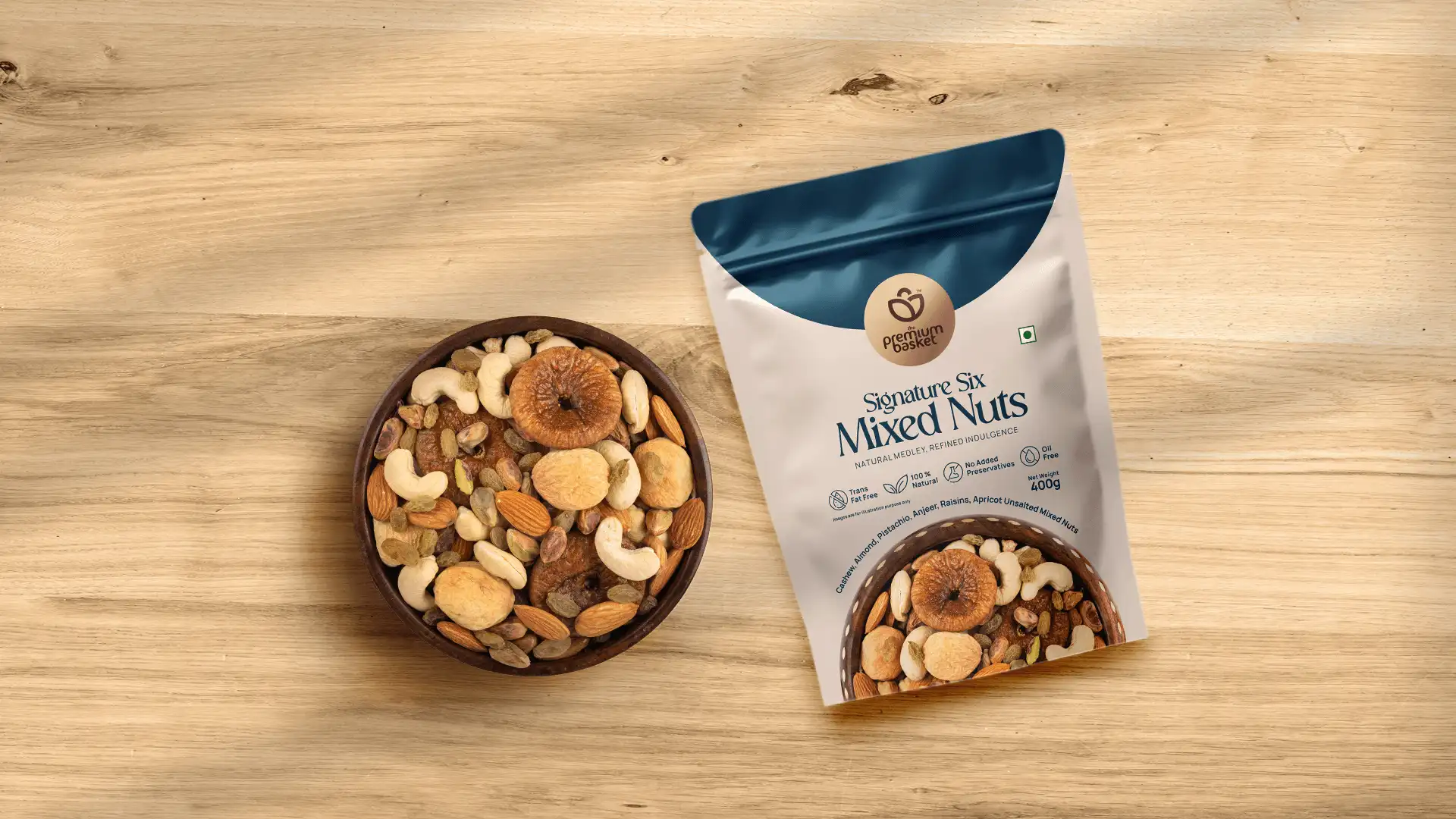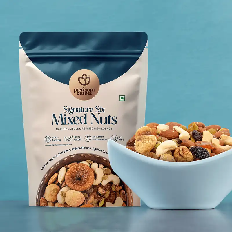 Experience the Signature Six Mixed Nuts, an elegant fusion of six world-class ingredients that embody purity, balance, and taste — Goa Cashews, California Almonds, Iranian Pistachios, Afghan Anjeer (Figs), Afghan Raisins, and Afghan Apricots.
