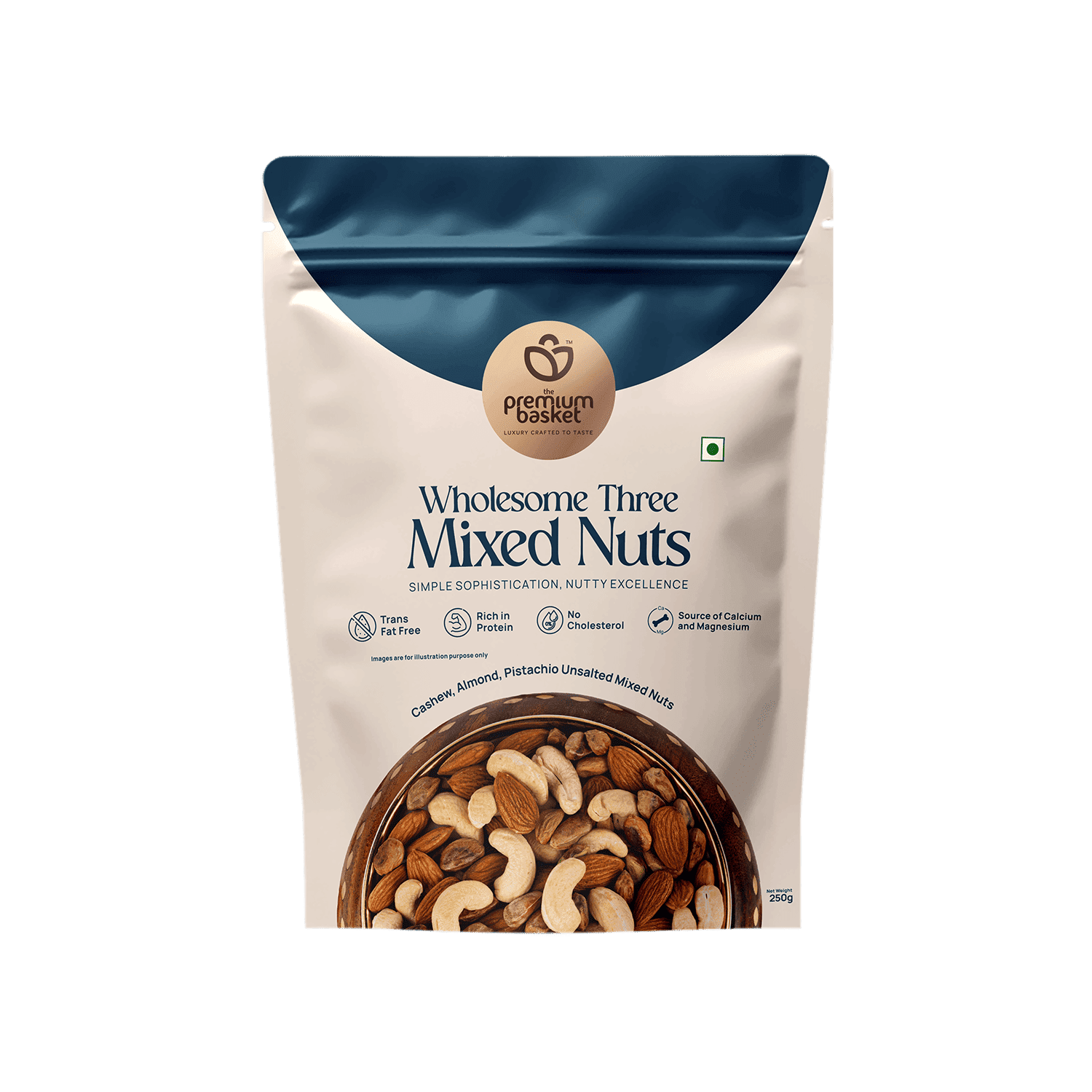 Trans Fat Free and naturally cholesterol-free, Wholesome Three Mixed Nuts embody the perfect balance between taste, health, and simplicity — crafted for those who appreciate quality in every handful.